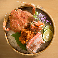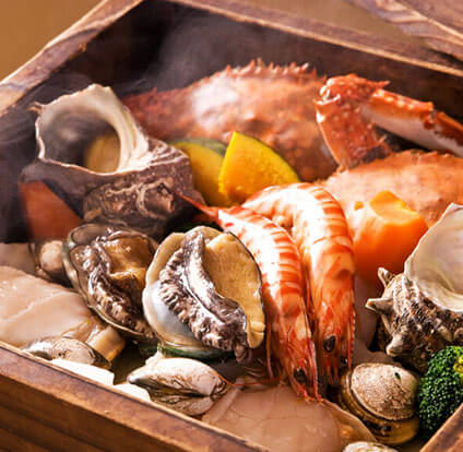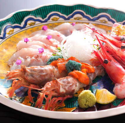 This is the delicate, eye-catching Kaga cuisine that originated under the rule of the wealthy Kaga clan. The simple yet delicate cuisine presented on beautiful Kutani-ware dishes is absolutely gorgeous. Our elegant Kaga and Kanazawa cuisine makes liberal use of local marine and mountain products.