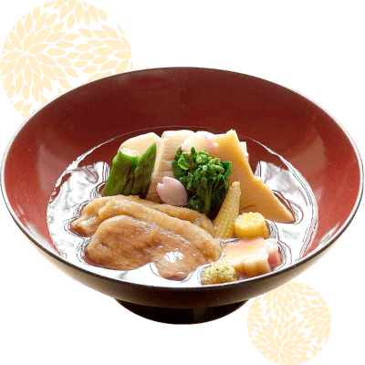 のとやでは、定番の冬の『鴨の治部煮』だけでなく、神田板長がどの季節でも郷土料理が楽しめますよう、季節の野菜を使った創作料理として、春夏秋冬の『鴨の治部煮』を楽しんでいただいております。春は、鴨とすだれ麸の他に春野菜と筍を一緒にご提供いたします。夏は暑くても食欲が増すように、涼しく感じるお料理として、目でも舌でも楽しむことができます。実りの秋の治部煮は、秋食材と脂が乗ってきた鴨との取り合わせが自信の美味しさです。いずれにしても、金沢の人に愛され続けられた『治部煮』でございます。